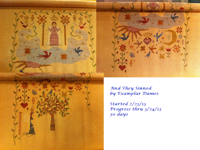 I'm keeping busy working on And They Sinned, reaching the 30 day point on Sunday March 24th. Some days I don't get any stitching done, but I seem to make up for it on the weekend. This week I'll definitely be finished with page 1 and on to page 2. The chart has only 3 1/2 pages, so this is moving along nicely!