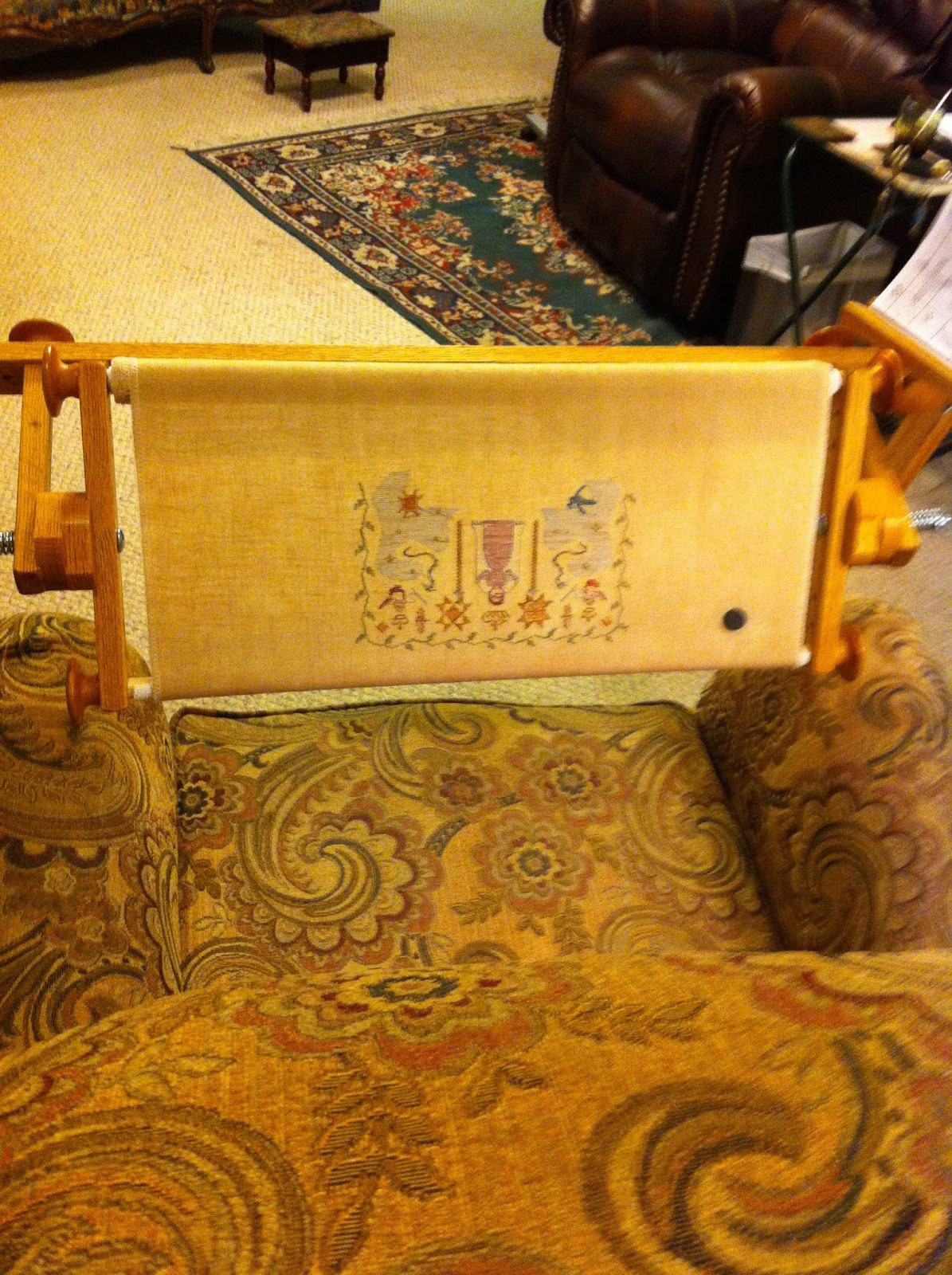 My progress was slow in the past couple of weeks. I had a business trip to New Orleans for a few days, then a few days after I got home I had such a terrible cold that they sent me home for 2 days to rest & recoup. I'm better now, so hopefully I will get back on pace. I'm about 1/2 done, so I took it off the floor frame for this photo. For our newbies, I'm stitching mine on 36 ct. Lakeside Linen in Vintage Sand Dune using the suggested threads.